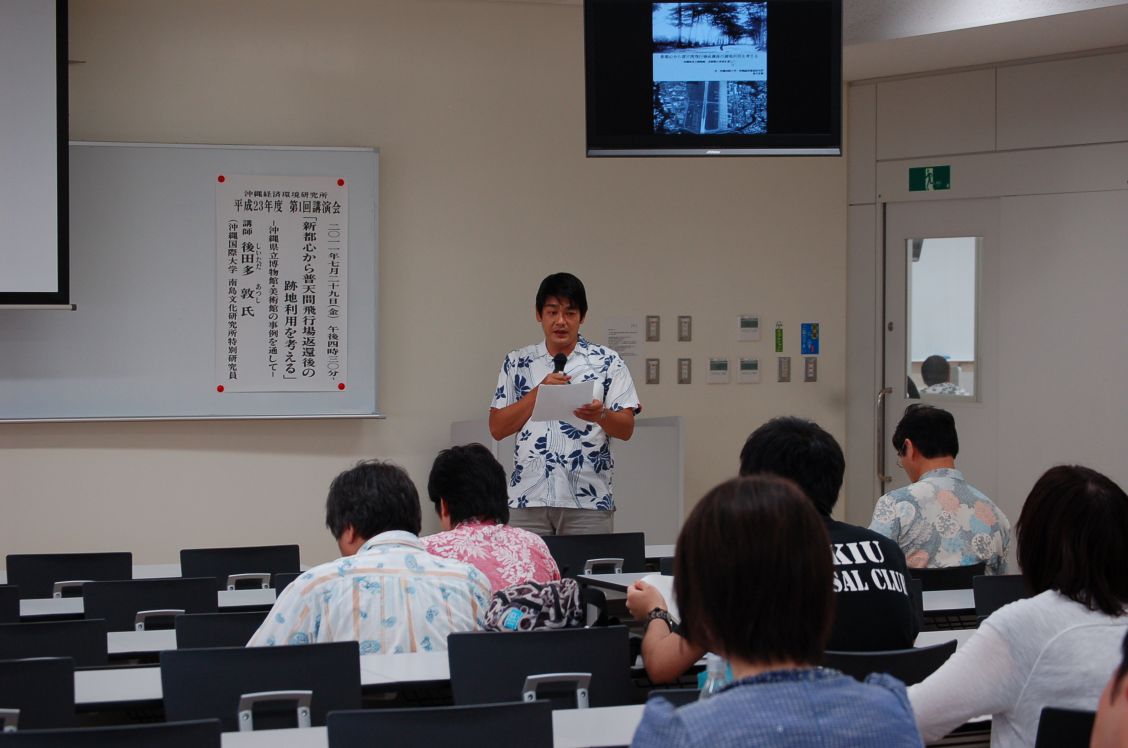 沖縄経済環境研究所では、7月29日(金)に13号館3階 13-301教室において、沖縄国際大学 南島文化研究所特別研究員の後田多敦(しいただ あつし)氏を講師にお迎えして、「新都心から普天間飛行場返還後の跡地利用を考える -沖縄県立博物館・美術館の事例を通して-」をテーマに第1回講演会を開催いたしました。