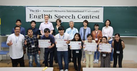 優勝は、「My Challenge」という題でスピーチをした比嘉 友里香さん(英米言語文化学科1年)でした。第2位は、古堅 靖之さん(英米言語文化学科2年)、第3位は、前原 涼さん(英米言語文化学科2年)、奨励賞は、大城 沙菜さん(英米言語文化学科3年)で、会場が選ぶ特別賞は上柏 里々花さん(英米言語文化学科4年)でした。