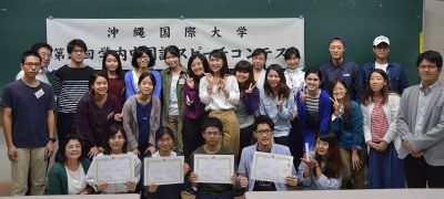 一位は、「上海旅行での留意点」という題でスピーチをした宮里 鈴乃さん(英米言語文化学科1年)でした。二位は権左 佳彦さん(社会文化学科2年)、三位は、東風平 朝敬さん(地域行政学科2年)、奨励賞は、下地 千晶さん(社会文化学科3年)、特別賞は金城 和希さん(社会文化学科2年)でした。今回の大会では発表者それぞれが頑張っていました。