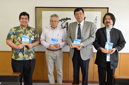 2016(平成28)年4月26日、本学沖縄経済環境研究所の共同調査研究の成果をまとめた、叢書『宮古の挑戦 エコアイランドによる地域活性化』について、本学学長へ発刊報告を行いました。前津学長、小柳副学長(総合研究機構長)、沖縄経済環境研究所名嘉座所長らが出席し、名嘉座所長が今回の叢書の説明と献本を行いました。