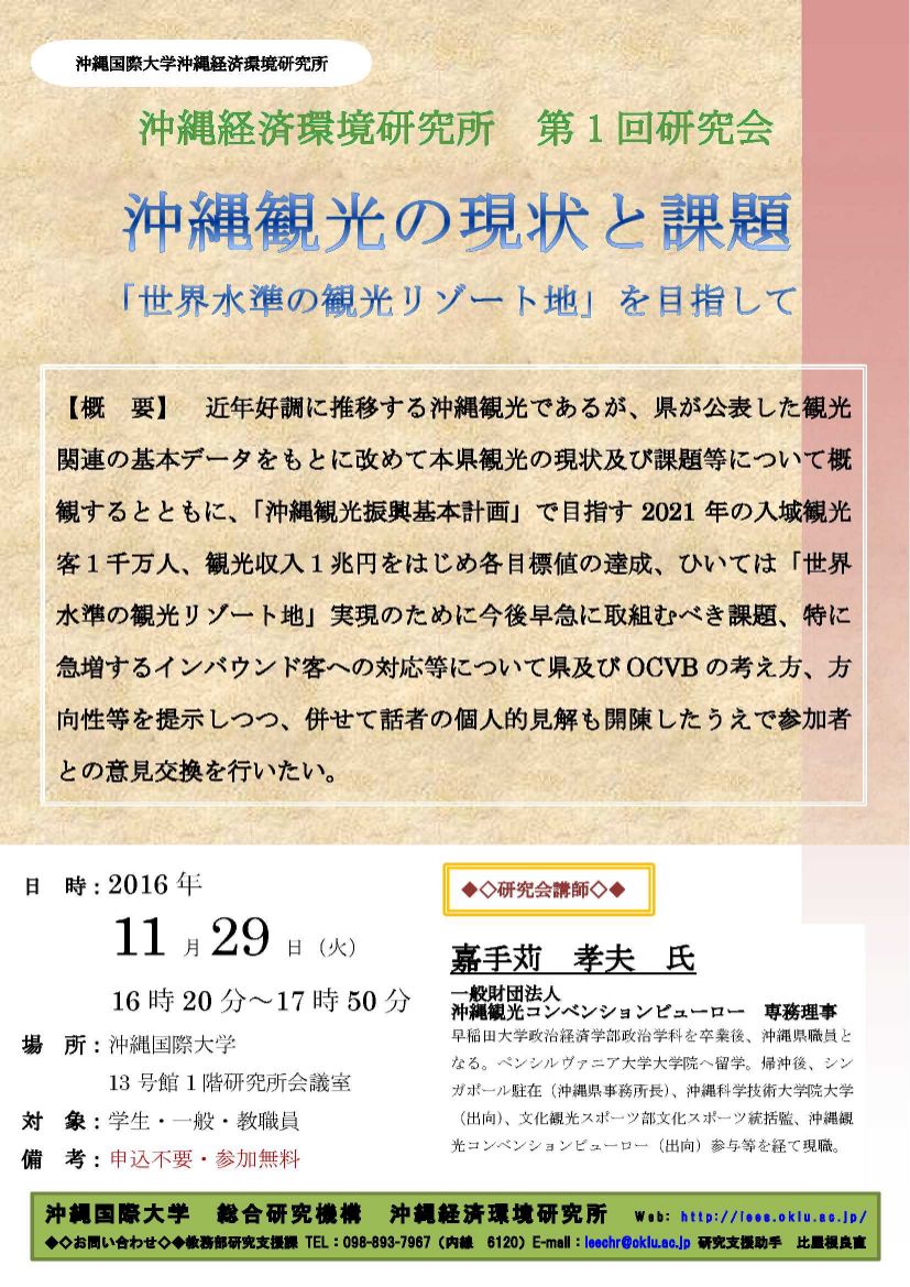 【経環研】2016(平成28)年度 第1回研究会 沖縄観光の現状と課題-「世界水準の観光リゾート地」を目指して- を開催しました。