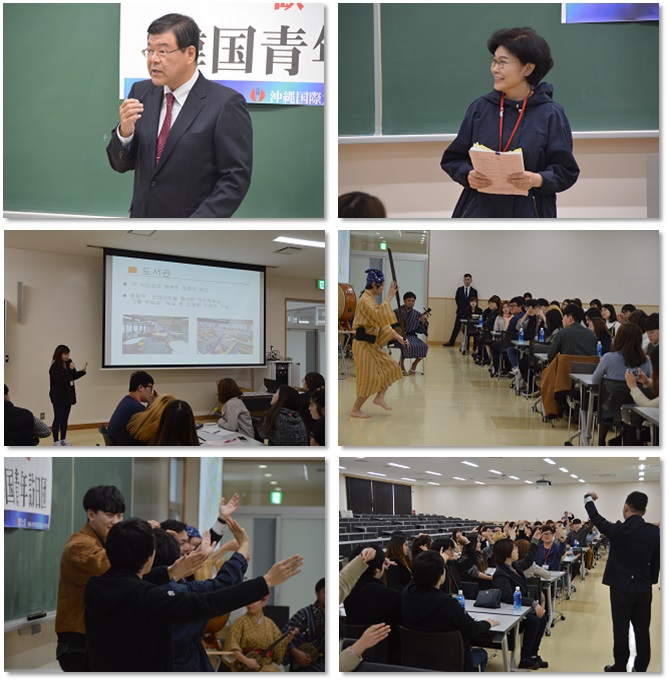 まず、本学の前津榮健学長による歓迎の挨拶に続き、カム・ヨンヒ訪日団団長(韓国東明大学教授)による開会の挨拶でスタートした交流会は、本学の学生サークル「琉球芸能文学研究会」による歓迎セレモニーで盛り上がりました。また、本学の学生による大学説明およびキャンパス見学のほか、グループディスカッションと沖縄のことばに触れるゲームなどのプログラムも設けられ、学生間の交流を深めました。