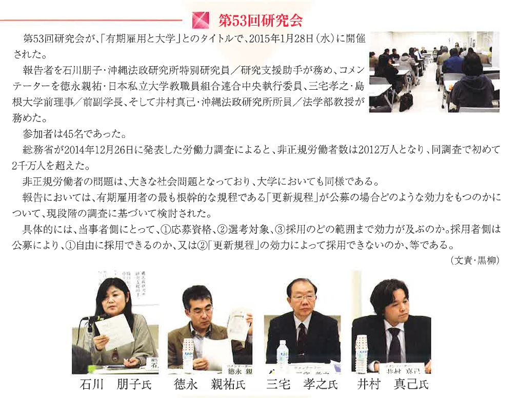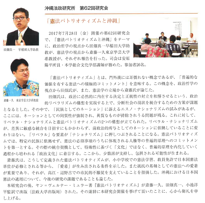 ![]() 青木洋英 (沖縄法政研究所所員/沖縄国際大学法学部講師) | ![]() 村井忠康 (沖縄法政研究所副所長/沖縄国際大学法学部教授) | ![]() 佐藤学 (沖縄法政研究所所長/沖縄国際大学法学部教授) |