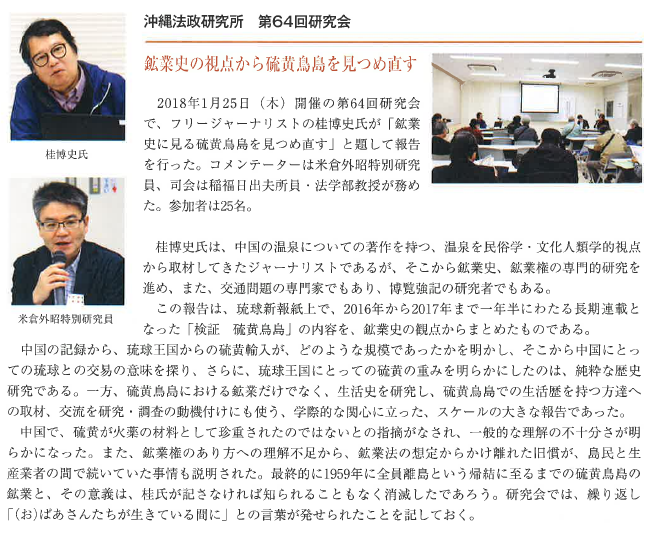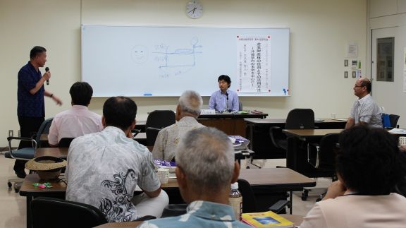 ![]() 報告:三宅孝之 氏 (沖縄法政研究所特別研究員/島根大学名誉教授) | ![]() 比屋定泰治 (沖縄法政研究所所長) |
