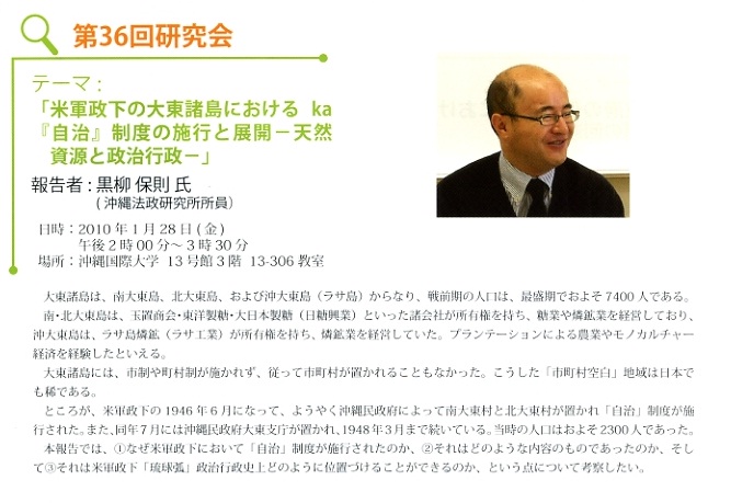 ![]() 報告者:山岸健太郎 氏 (沖縄法政研究所特別研究員/中京大学非常勤講師) | ![]() 司会:黒柳保則 (沖縄法政研究所副所長/沖縄国際大学法学部准教授) | ![]() |
