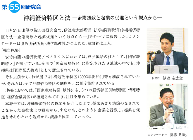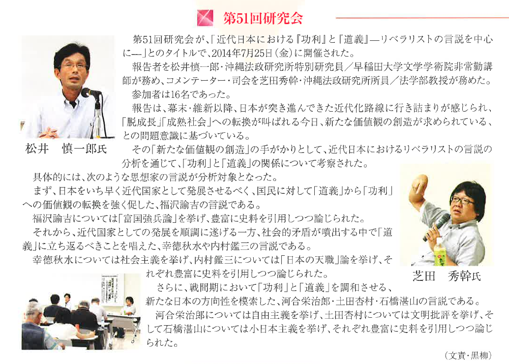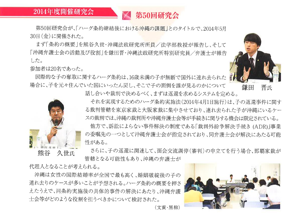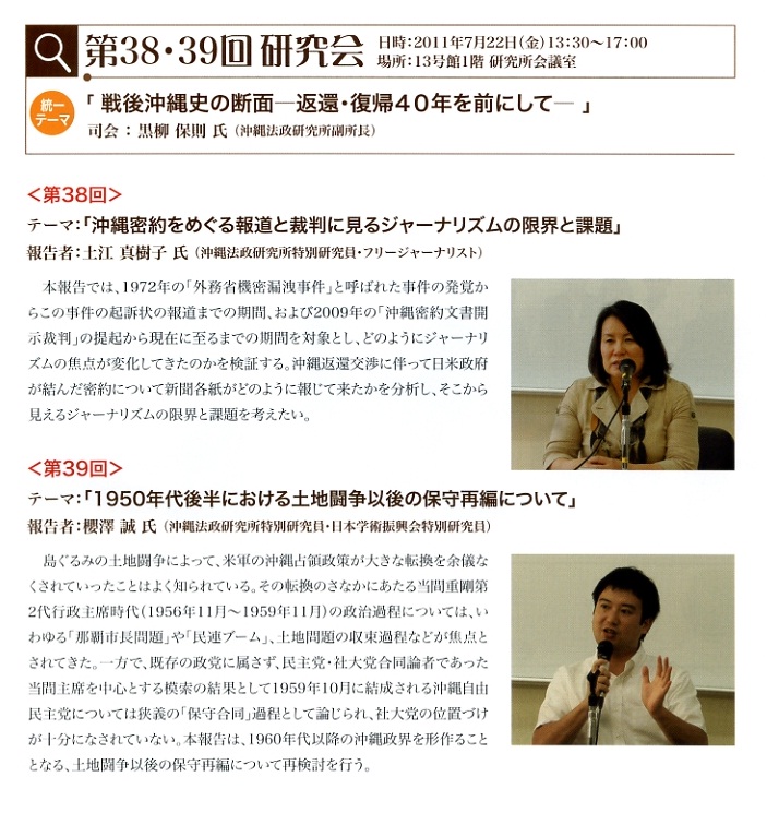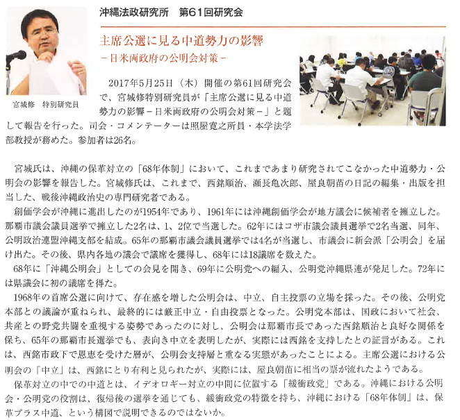 ![]() 報告者:芝田秀幹 (沖縄法政研究所所員/沖縄国際大学法学部教授) | ![]() コメンテーター:稲福日出夫 (沖縄法政研究所所員/沖縄国際大学法学部教授) | ![]() |