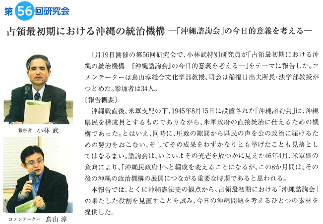 ![]() 報告:小林武 氏 (沖縄法政研究所特別研究員/沖縄大学客員教授) | ![]() 司会:比屋定泰治 (沖縄法政研究所所長) |