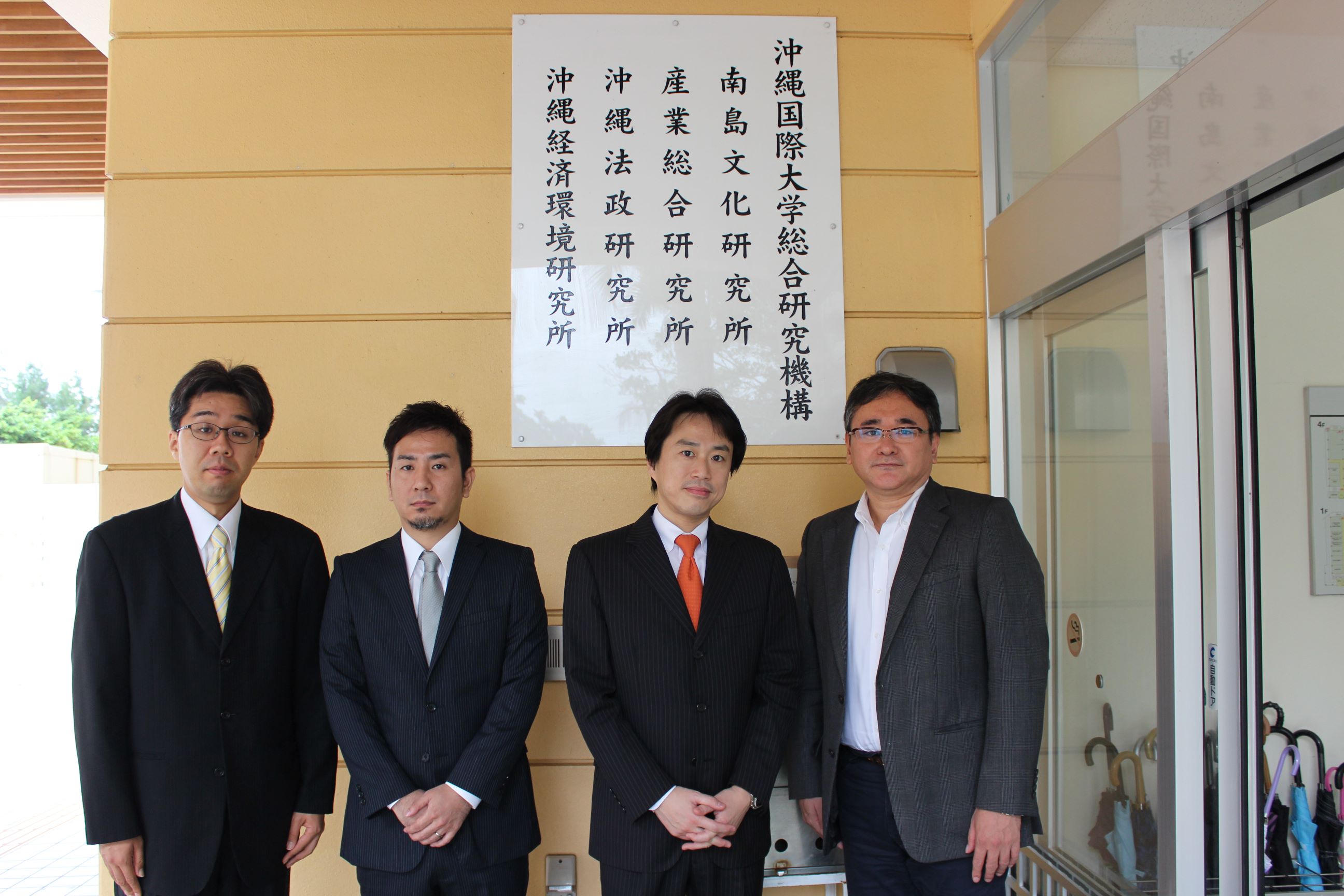 株式会社パットウェブからは、代表取締役の百足顕士様、取締役の屋富祖秀樹様が来訪され、当研究所所長室(13号館1階)にて寄付金贈呈式が執り行われました。研究所からは、田口副所長、安里所員が出席しました。