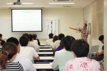 今回、企業のコミュニケーション活動を手がける専門家(広告会社)をお招きし、広告開発のプロセスを中心に報告いただきました。企業のコミュニケーション戦略を立案する上で、クライアント企業の持つ情報的価値を探りだすことの重要性や、AIDMA理論に基づいたクリエイティブストーリー作りなど制作現場のお話しをいただきました。