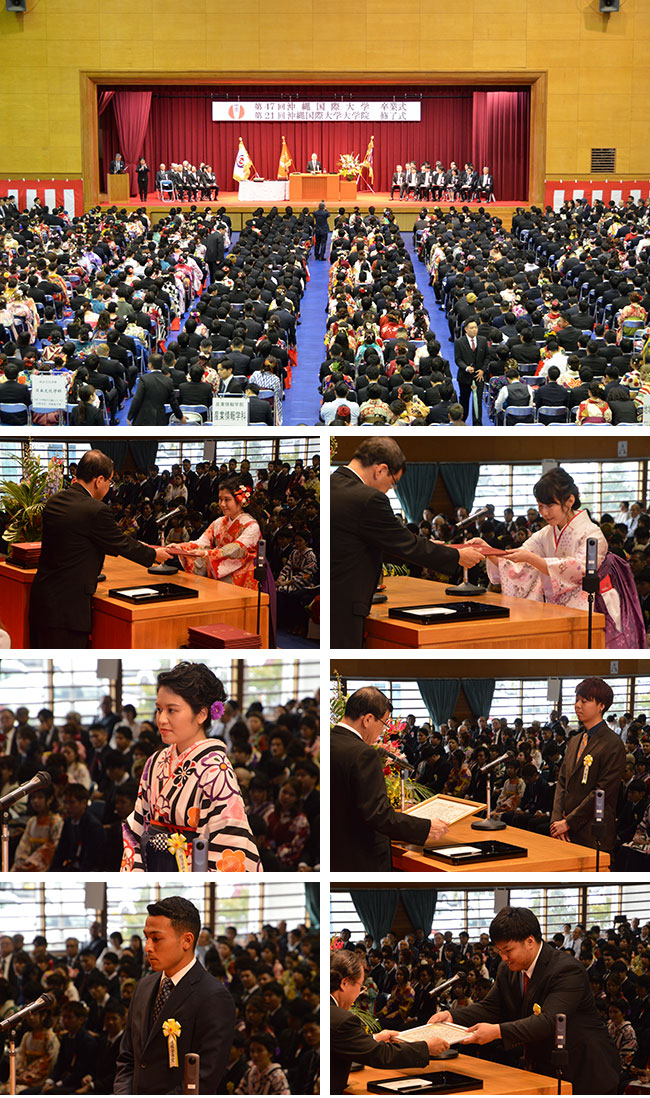 各学科卒業生及び大学院修了生の代表に、卒業証書・学位記が授与された後、学業や課外活動・スポーツなどで顕著な功績があり、他学生の模範となる卒業生に対して表彰が行われました。