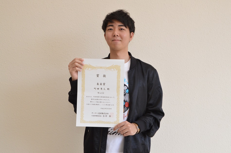 企業システム学科でマーケティングを学びながらアーティストとして活躍する町田隼人さん(企業システム学科4年次/コザ高校出身)がターナーアワード(主催:ターナー色彩株式会社)で「未来賞」を受賞しました!
