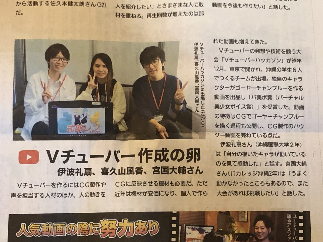 琉球新報[2019.1.13]紙面、ならびに、ウェブマガジン[2019.1.15]にて「Vチューバー作成の卵」としても紹介されています。