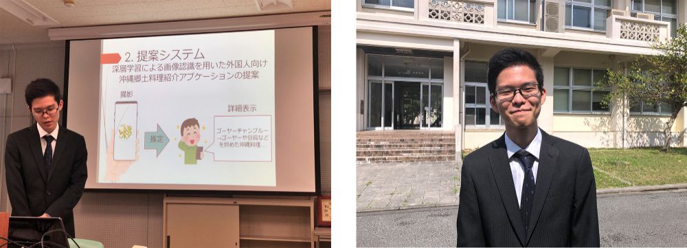 2019年2月28日(木)に琉球大学で開催されたJSiSE学生研究発表会において産業情報学科4年次の國仲広大さんが「深層学習による画像認識を用いた外国人向け沖縄郷土料理紹介アプリの制作」の発表において優秀発表賞(口頭発表)を受賞しました。