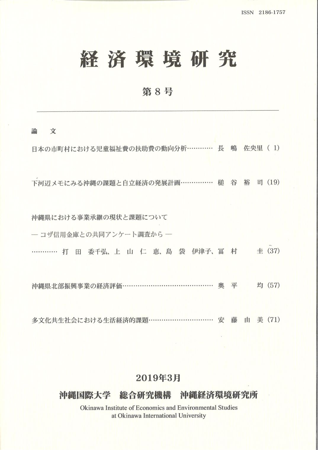 沖縄経済環境研究所では、研究紀要『経済環境研究』第8号を発刊いたしました。