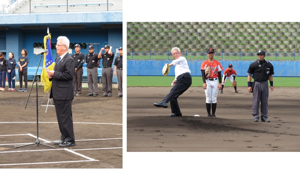 九州地区大学野球選手権南部九州ブロック大会・沖縄地区予選は、第98回大会(2017年秋季大会)から「沖縄県農業共同組合」様が特別協賛社として加わり大会を開催しております。今大会の開会式では、特別協賛社あいさつを沖縄県農業協同組合理事長の大城 勉様から頂戴し、始球式も行っていただきました。誠にありがとうございました。写真はあいさつと始球式のようすです。