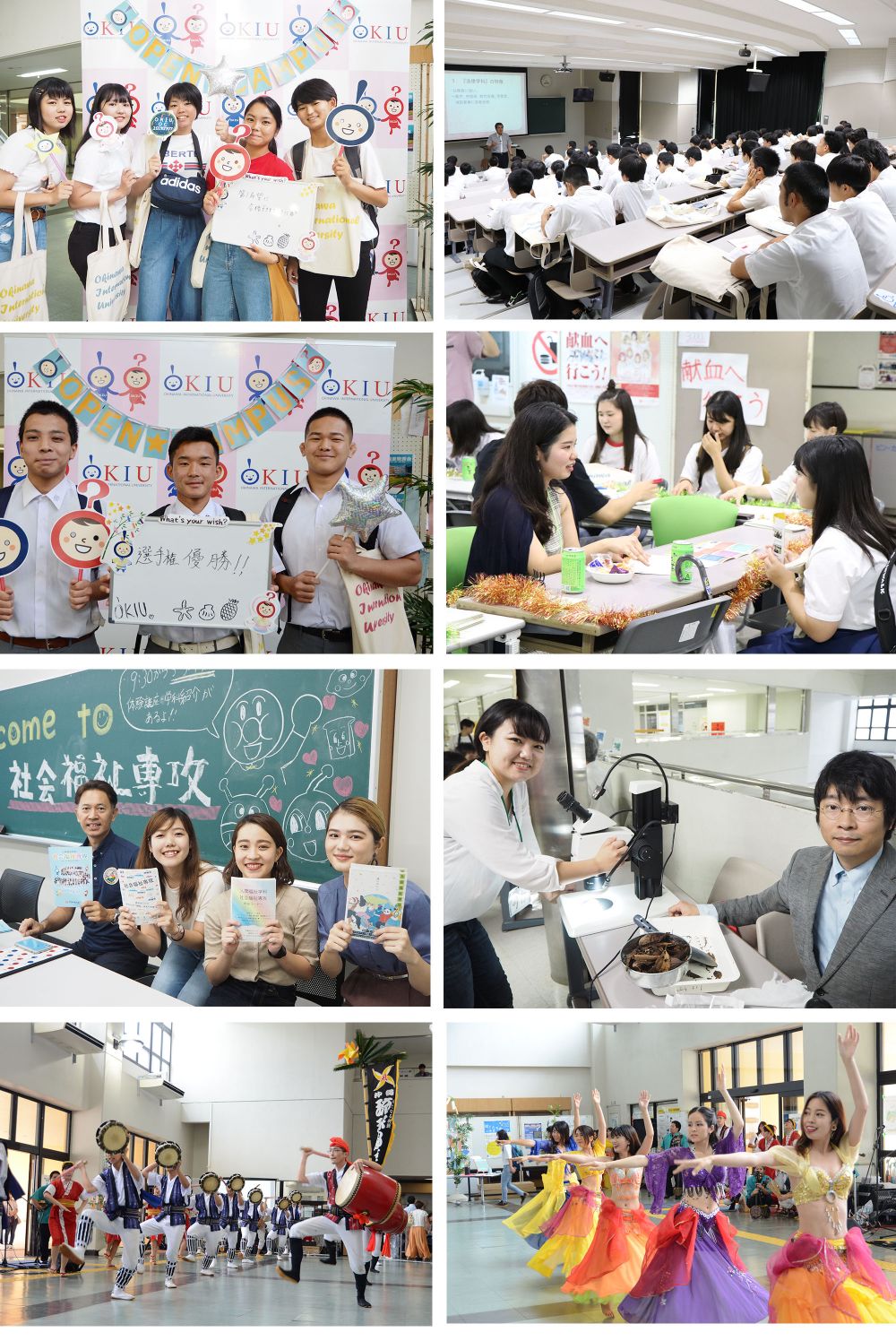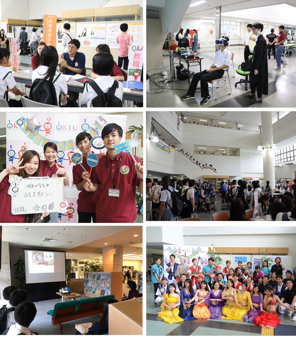 各学科の学科紹介や体験講座はもちろん、入試や国内・外留学や奨学金などの相談ブースも設け、多くの皆さまにご活用いただきました。また、在学生によるキャンパスツアーやサークル展示、昼休みにはエイサーサークルの風車、中東芸能クラブのベリーダンスなどパフォーマンスもあり、沖国大の魅力を存分に感じていただけたのではないでしょうか?