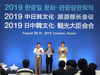 今回私たちは、今年8月29日から30日の期間で行われた、「第9回日中韓文化・観光大臣会合」の関連行事「未来世代フォーラム」に参加するため、韓国の仁川に訪れました。このフォーラムは未来の観光人材である日中韓大学(院)生の代表90名を招待し、交流と親睦の機会を提供することで3カ国間の観光を通じた観光発展法案について討議することを目的とした大会です。そこで日中韓の学生らが一緒になり、韓国の伝統菓子作り体験や、ダンス体験などを通して、交流を深めていくプログラムや、“映像”“ポスター”“提案書”の3つの部門のアイディア作品を互いに発表し合うというプログラムに参加しました。私たちは2つの部門で作品を提出しました。一つは提案書の部門で沖縄のスマイルタグというシステムを参考に日中韓の重要な観光施設、交通機関で利用できる「KJC Y-PASS」というシステムに着目した「KJC Y-PASS Construction for Development of Tourism」、二つ目はポスター部門で女性の一人旅を支援するシステム「Bodyguard for Woman Travelling Alone」でありました。2つの作品はそれぞれ奨励賞をいただきました。 今回の大会では、言語の違う三国の学生との交流で不安な部分が多かったですが、片言の英語とジェスチャーを用いた意思疎通で仲を深めることができました。また、他の学生のアイディア作品はとても興味深く、またプレゼンテーションスキルのレベルの高さに圧倒されました。大会時期の日韓の情勢が不安定な中での開催でありましたが、学生たちの間ではそれを感じさせず、文化の違う学生同士でのよい意見交換の場となりました。この大会を通して、国境を越えた学生同士での交流や他国の文化に触れることができ、また発表のレベルの高さを感じるなど、大学での学びを深めた刺激のある体験になりました。この体験を通して得た学びを今後の学生生活に活かしていきたいと思います。(以上)