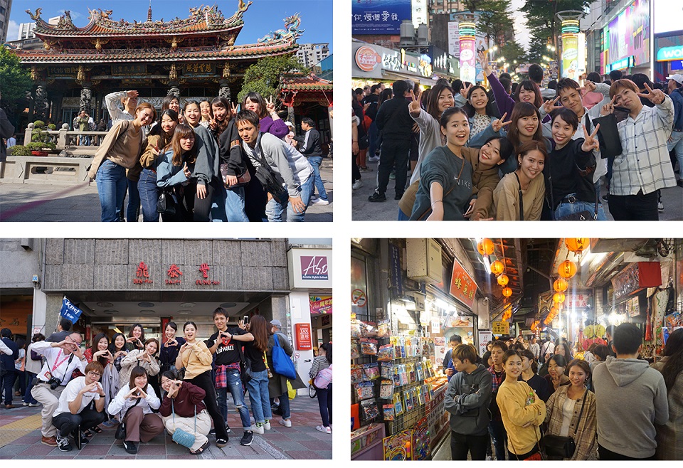 1日目は龍山時、迪化街、西門町、士林夜市の4つの観光地を訪れ、2日目は忠烈祠、中正紀念堂、行天宮、永康街、十份、九份の順に回りました。龍山時や行天宮では、観光客だけでなく地元の方々もお供え物や線香を持ち、台湾独自の方法で参拝していました。私達もそれと同様に参拝し、台湾の伝統文化に触れることができました。