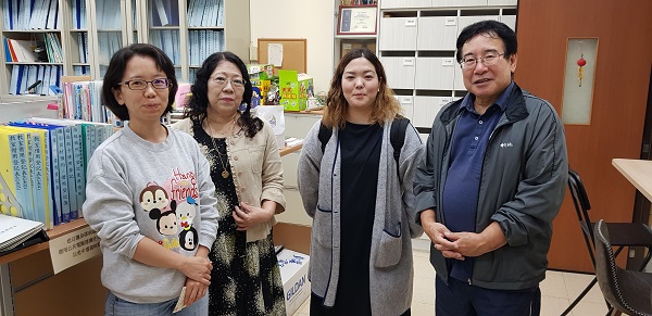 写真2:朱先生、尚先生、本学卒業生の伊礼さん、兼本先生(2019年11月22日、国立台北教育大学にて)