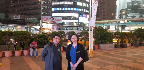 写真1:兼本先生と李先生(2019年10月30日、忠孝東路SOGO百貨店前にて)