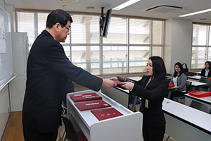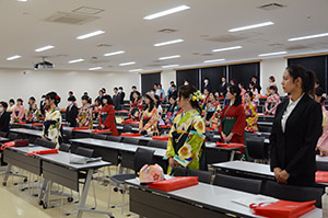 新型コロナウィルス感染拡大に伴い本学では十分な配慮を心掛け、式典を挙行しました。例年のような、体育館での式典ではなく、各学科、大学院に分かれ卒業証書、修了証書の授与式が行われました。