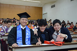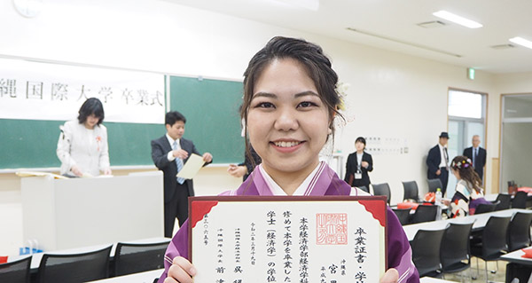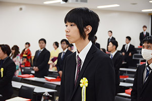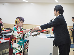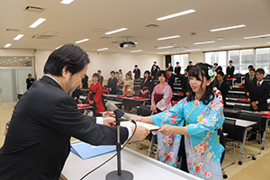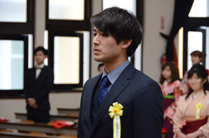 又、人物及び学業ともに優秀で他の模範となる学生として仲里智哉さん(産業情報学科)に産業情報学部長賞、宮城伸尭さん(日本文化学科)に総合文化学部長賞がそれぞれ贈られ、校友会長賞を髙着雅文さん(人間福祉学科)が受賞しました。