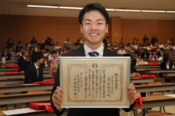 【校友会長賞受賞の髙着雅文さん(人間福祉学科)】
