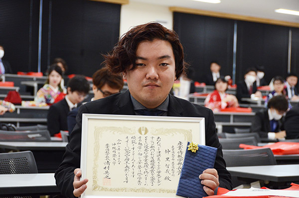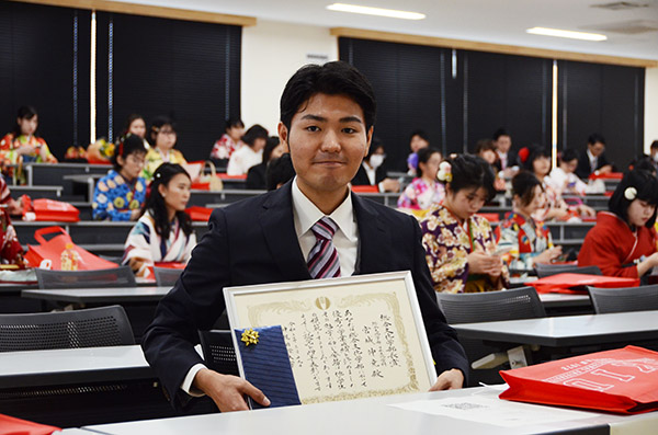【総合文化学部長賞受賞の宮城伸尭さん(日本文化学科)】