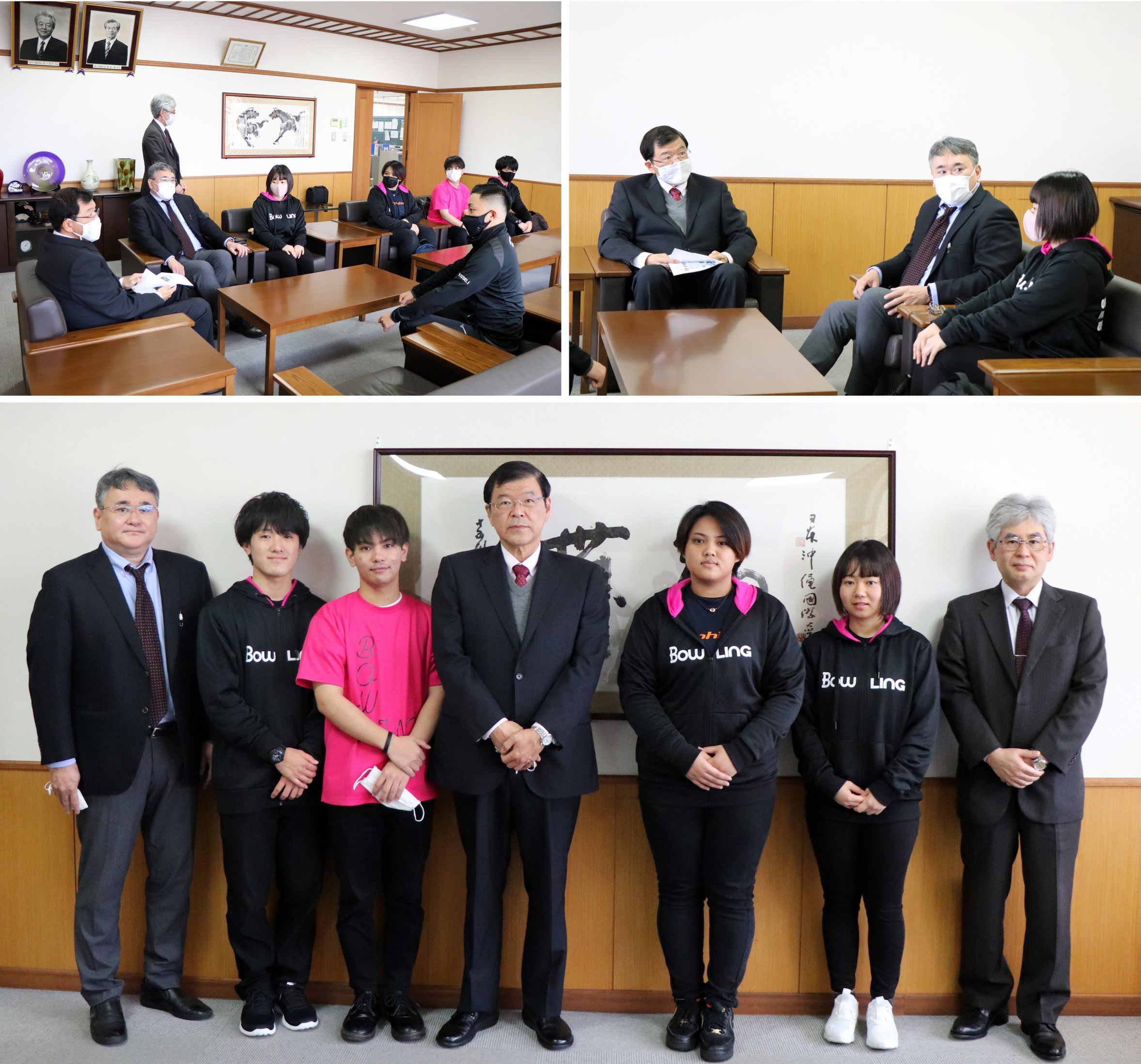男女ボウリング部は、大城美幸さんが発起人となり入学直後の2018年に創部3年目で偉業を達成しました。学長からは、「コロナ禍において練習の制約がある中で、様々なことを工夫して実績を残したと思います。これからも練習を継続し、次年度は男女全国制覇を目指して頑張ってください」というねぎらいと激励の言葉がありました。