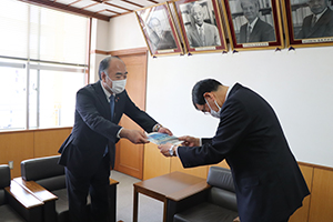 校友会の國吉会長より「コロナ禍のため園遊会を開催できないのはやむを得ませんが、どうにか卒業おめでというという気持ちを伝えたくて、新学食クーポンという形にさせていただきました」という経緯が伝えられました。前津学長からは、「今年度も新型コロナウイルス感染拡大防止のため、園遊会を開催出来ないことが気がかりでした。また、3月に学生会館の供用が開始されますが、3月卒業予定の学生に少しでも利用して欲しいと思っていたところ、校友会のご厚意によりクーポン券を配布できありがたく思います」という感謝の意が伝えられました。