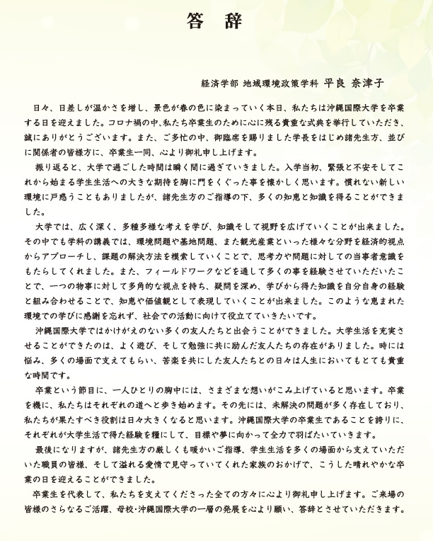 【答辞を書かれた平良奈津子さん(地域環境政策学科)】