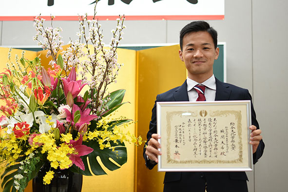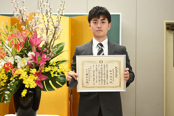 【校友会長賞受賞の松田駿太さん(英米言語文化学科)】