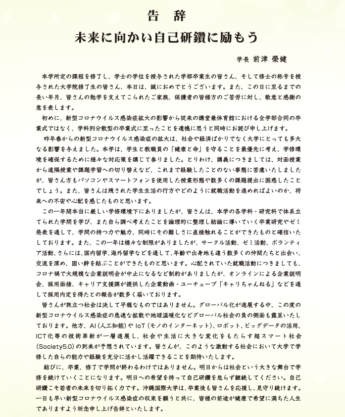 2021年3月19日(金)、各教室棟にて第49回卒業式並びに第23回大学院修了式を挙行しました。