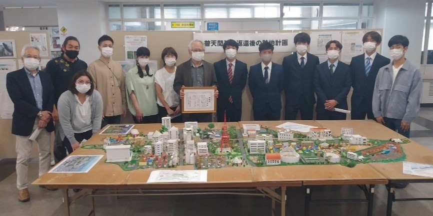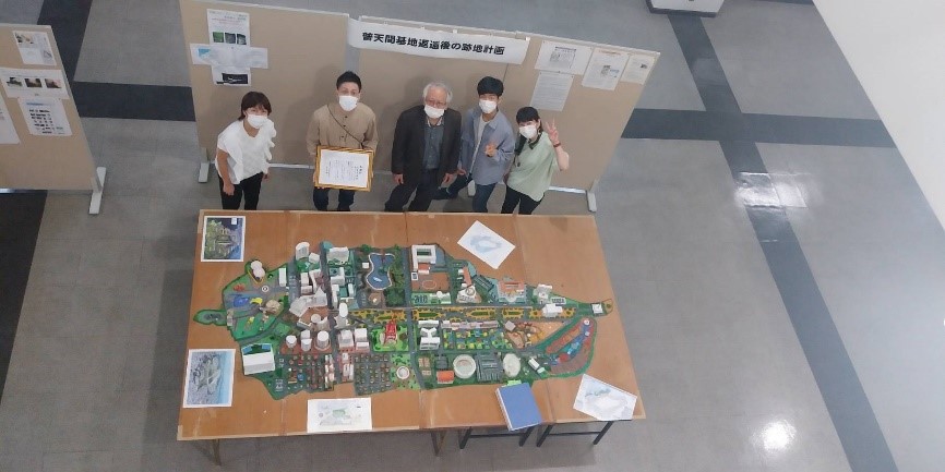 ご贈呈者の皆様と「米軍普天間飛行場跡地利用のジオラマ模型(「夢の街」)」の前で記念撮影