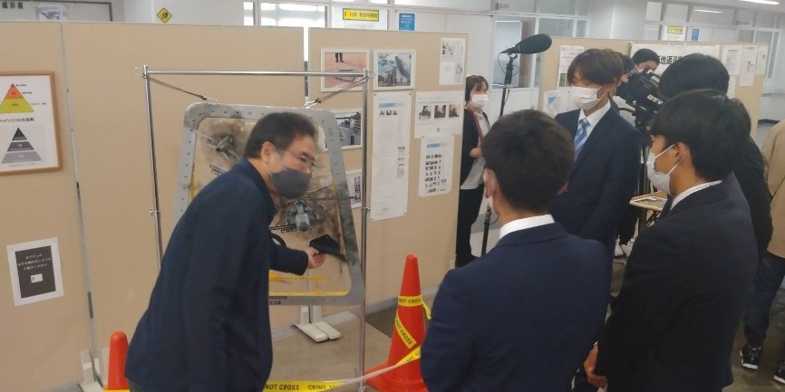 米軍機墜落事件や部品落下事件などをテーマにした作品で、2017年12月13日に宜野湾市立普天間第二小学校の運動場に落下した米海兵隊のCH53E大型輸送ヘリの窓枠を、ほぼ同じ大きさと重さで再現したレプリカ。窓枠のレプリカには、1959年に宮森小学校に墜落した米軍ジェット戦闘機の模型、2004年に本学に墜落した米海兵隊ヘリ(CH53D)の模型、2017年に緑ヶ丘保育園に落下した米海兵隊ヘリの部品レプリカ、さらに、同年、浦西中学校に落下した米海兵隊ヘリのゴム製テープのレプリカから構成されています。作成者でボランティア平和ガイドの仲村真氏は記憶の継承とさらなる墜落・落下事件への警鐘を鳴らしています。