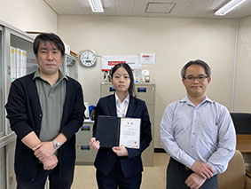 産業情報学科の長嶺ひな子さん(大山ゼミ)が2020年度CG-ARTS賞を受賞しました。この賞は公益財団法人情報教育振興協会の教育認定校である産業情報学科において,CG-ARTS検定合格者やCG・Web・ 画像処理・マルチメディア関連カリキュラムにおいて学業優秀な学生に贈呈されます。学内での授与式を2021年3月12日に学部事務室にて学科長,担当ゼミ教員,長嶺さんの関係者のみで行いました。