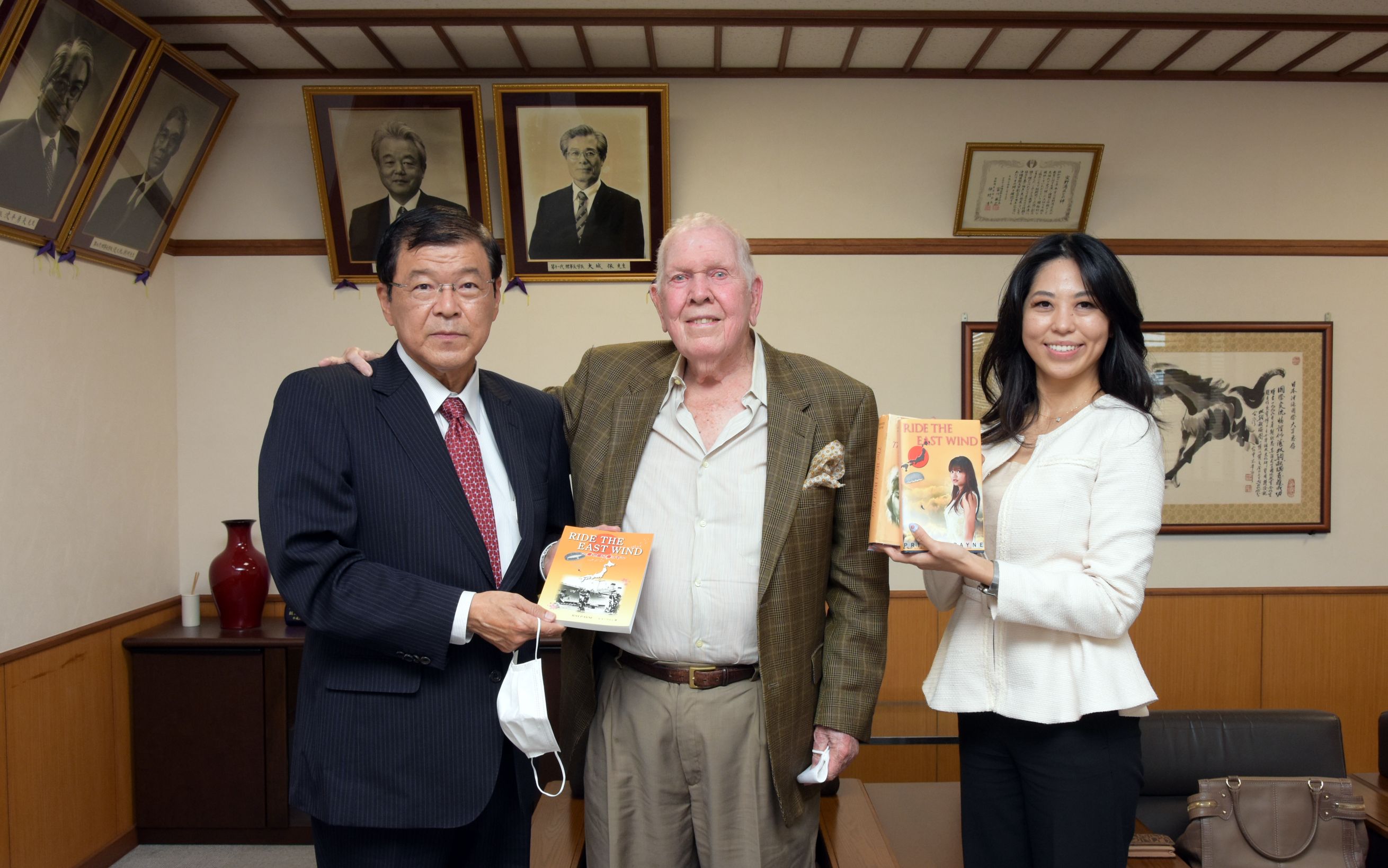 本学卒業生で翻訳業に携わる田仲敦美さん(2013年度法律学科卒業)とステーキハウスサムズの創立者レイ・ペインさんが、前津榮健学長を表敬訪問されました。田仲さんが日本語翻訳を担当した、レイ・ペインさんの自叙伝書籍「RIDE THE EAST WIND ~東の風に乗って~」の紹介のため来学でした。