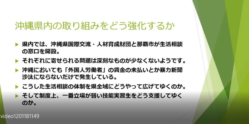 本発表では、「外国人労働者」をめぐる日本の自治体の政策潮流を踏まえた上で、「外国人労働者の依存時代」の沖縄の自治体が目指すべき政策の方向性について論じた