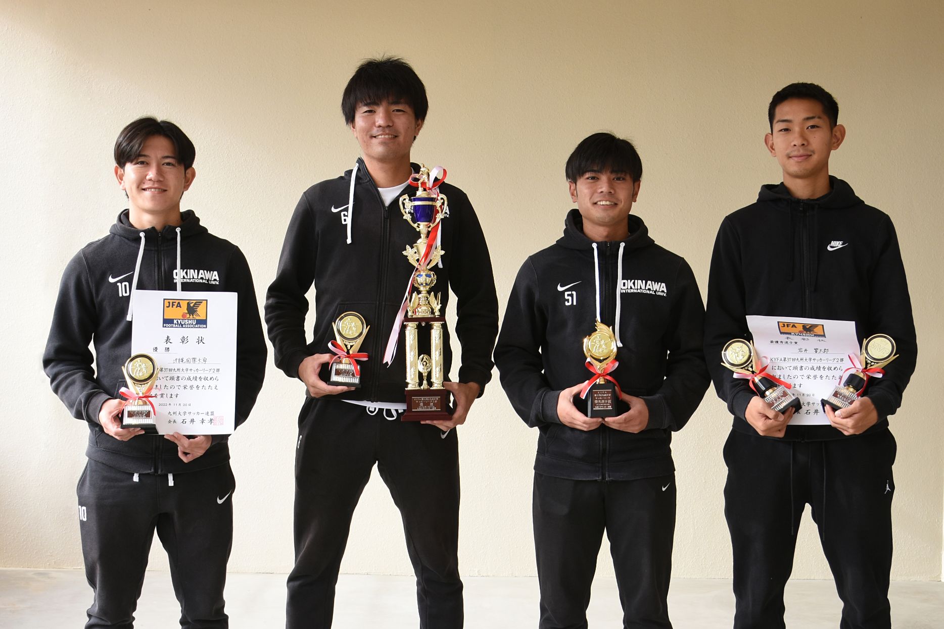 左より、ベストMF賞 :伊佐 航平さん(地域行政学科)、ベストDF賞:下地 陸斗さん(地域環境政策学科)、仲地 颯世さん(法律学科)、最優秀選手賞、