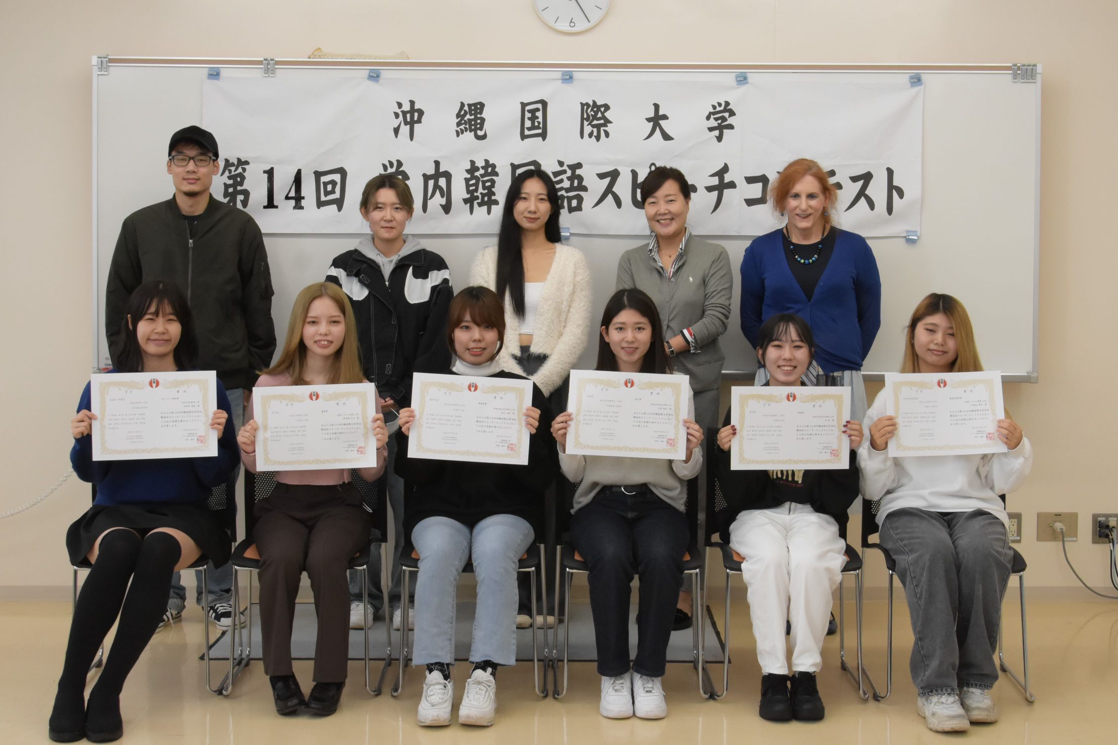 最優秀賞に輝いた大久さんのスピーチは、日韓の歴史認識における差を自らの視点で分析し、更に高い表現力も加わった素晴らしいスピーチでした。優秀賞の伊良部さんは、日韓のアイドルをマーケティングミックスの観点から比較分析したとても興味深いスピーチでした。他にも韓国のアイドルオーディンション番組の問題点を指摘したスピーチ(栄さん)や、語学を学ぶ意義について語ったもの(久銘次さん)、韓国の友達との出会いを紹介したもの(宇地原さん)、自己肯定感の大事さを語ったスピーチ(上原さん)まで、どれも聴く側の興味を引く素晴らしい内容とスピーチで入賞となりました。