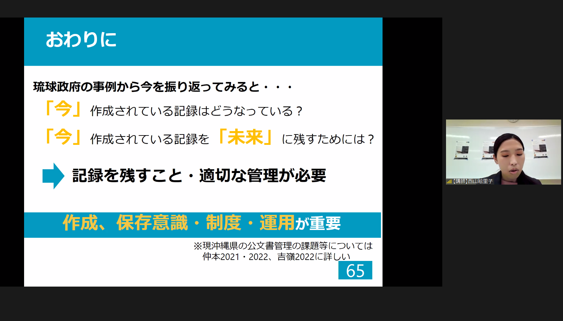 米国統治時代における沖縄(琉球政府)文書をめぐる経緯と動向に関する概観を教えて頂きました。そして、琉球政府文書など資料の経緯を学び、次世代に引き継ぐ事の大切さを感じました。また、たくさんの歴史資料を失った沖縄にとって、琉球政府文書は貴重な共有知的財産として、多くの人の熱意で沖縄県に引き継がれた経緯を知りました。現在の課題として、琉球政府文書のデジタル化事業の推進とweb上での画像配信事業の拡大などが挙げられる事も判りました。