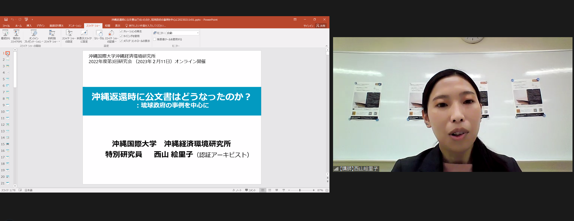 沖縄経済環境研究所では2023年2月11日(土)第3回オンライン研究会「沖縄返還時に公文書はどうなったのか?:琉球政府の事例を中心に」を開催いたしました。
