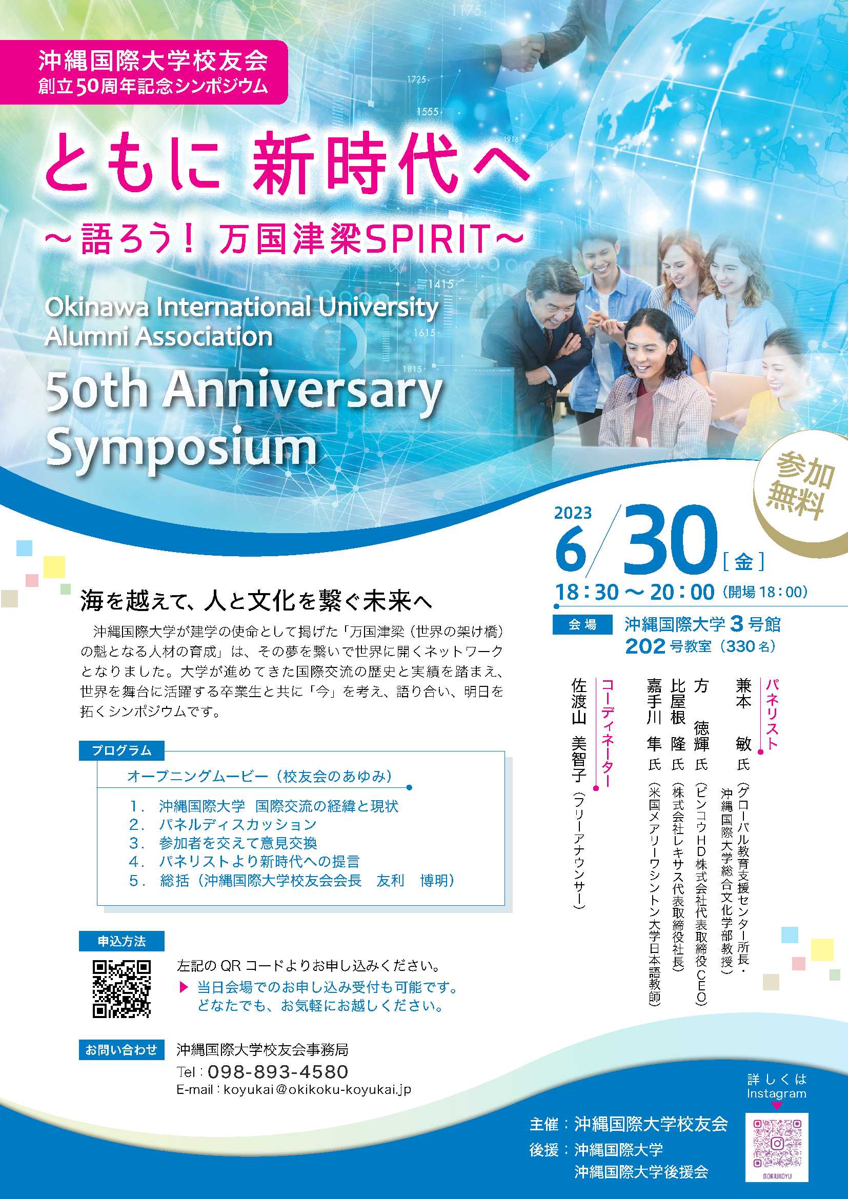 沖縄国際大学校友会では、「創立50周年記念シンポジウム ともに 新時代へ~語ろう!万国津梁SPIRIT」を下記の日程で開催いたします。