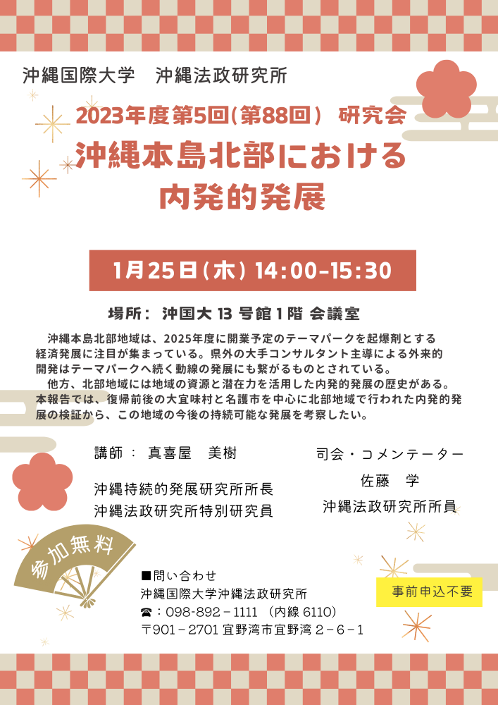沖縄法政研究所では2024年1月25日(木)に、第5回(88回)研究会として「沖縄本島北部における内発的発展」 を開催いたしました。