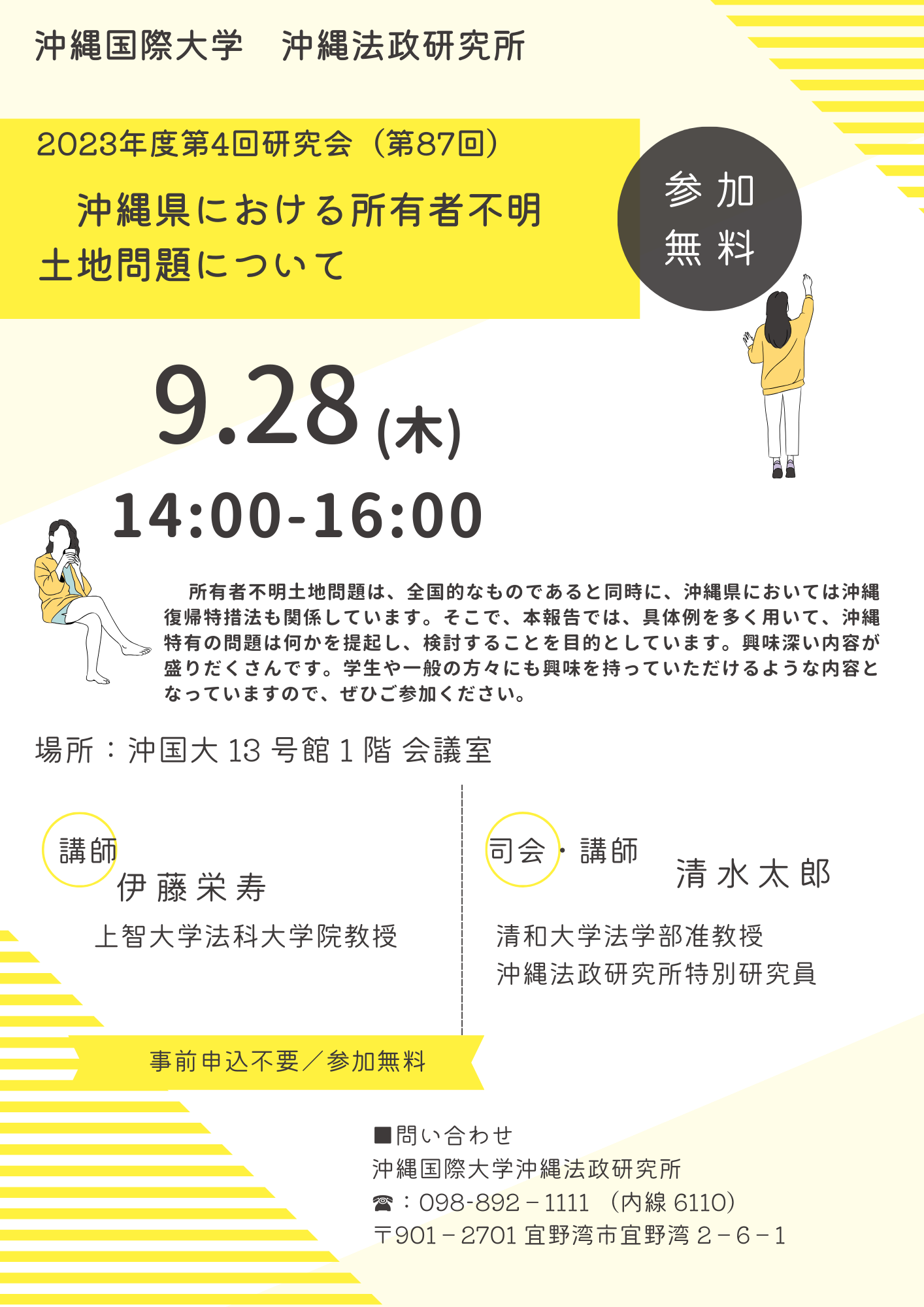 沖縄法政研究所では2023年9月28日(木)に、第4回(87回)研究会として「沖縄県における所有者不明土地問題について」 を開催いたしました。