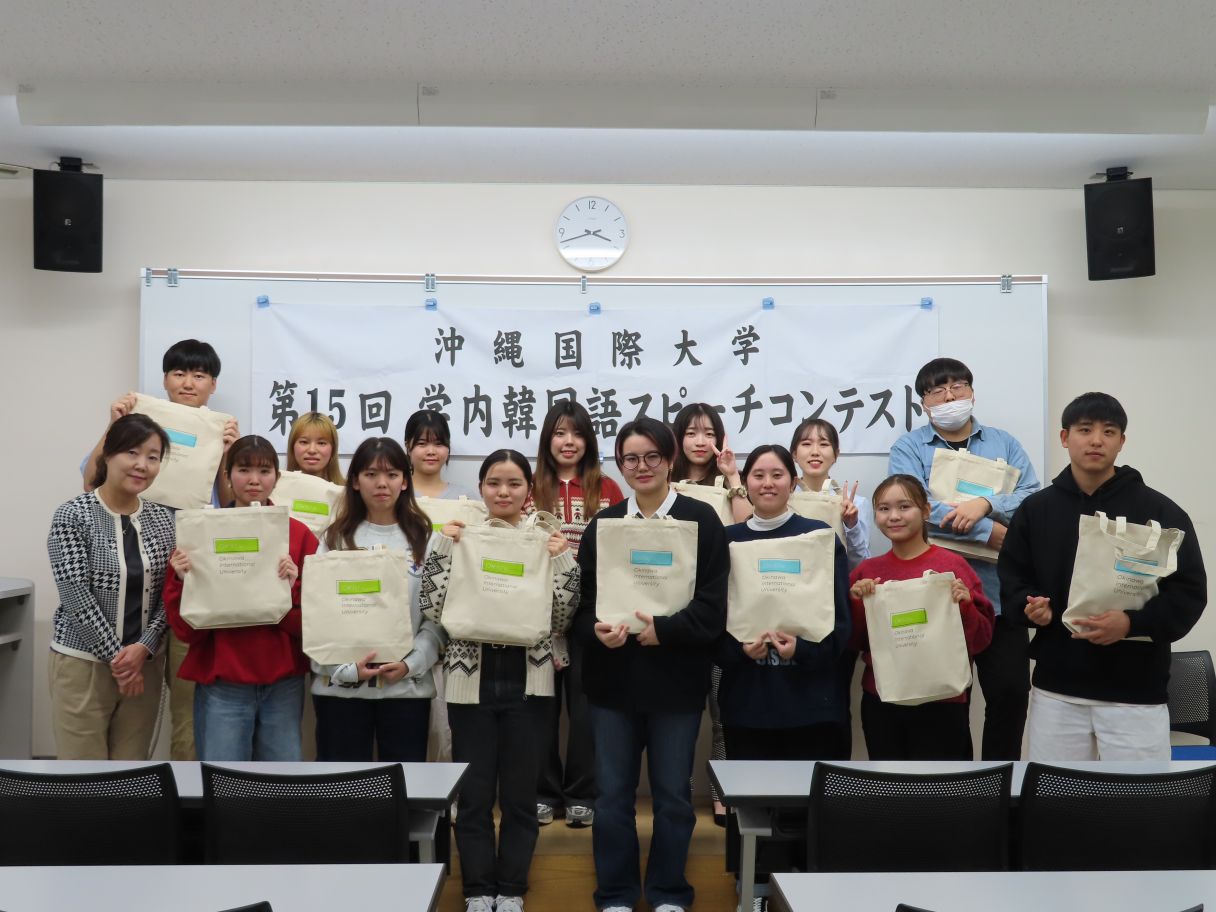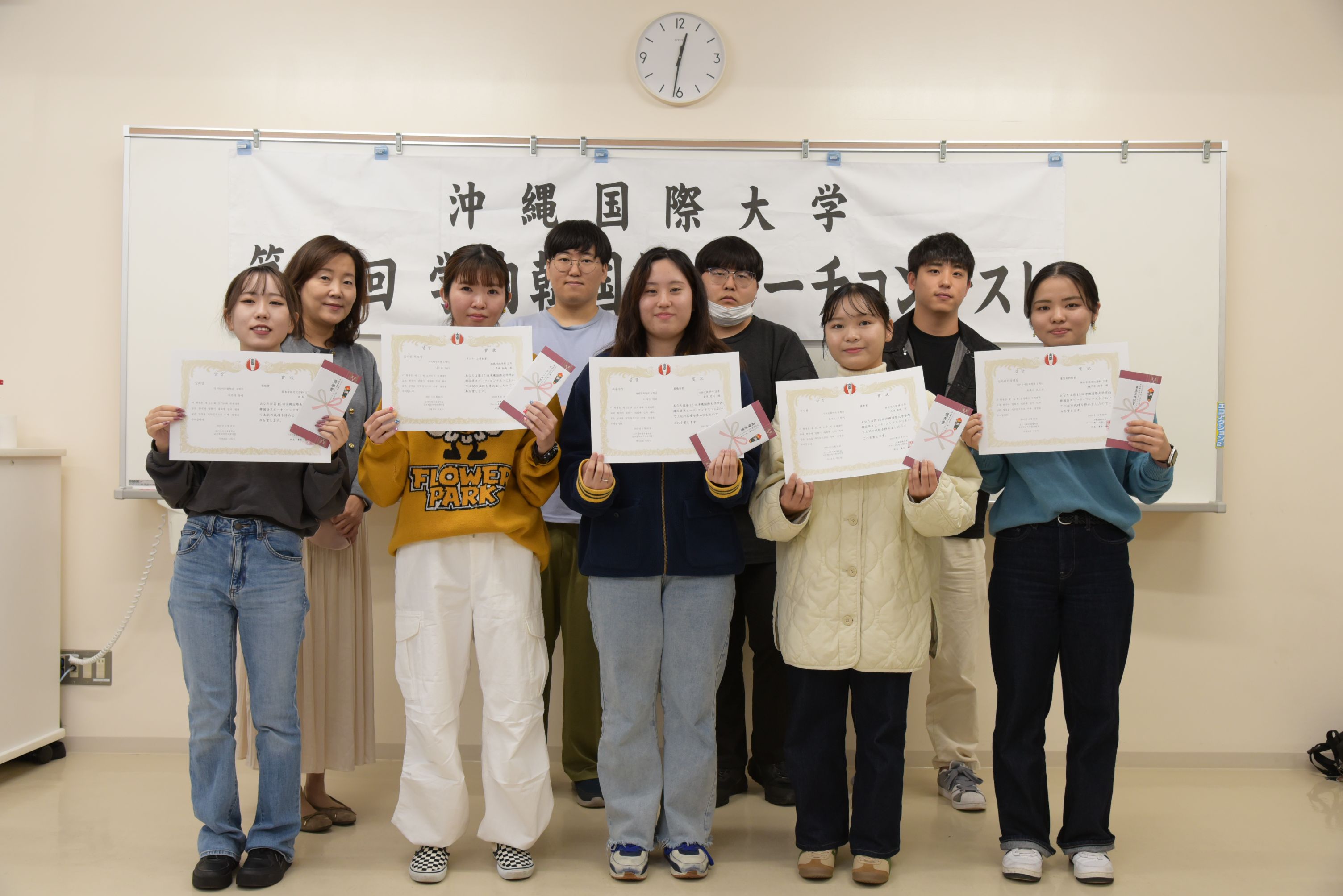 また、夏休みの韓国語学文化セミナー参加を通して得た学びをスピーチした大城さん(優秀賞)や、最近話題のMBTIについて過度な没入には注意すべきであると指摘した栄さん(奨励賞)、日本と韓国のアイドルについてデビューへの道のりや音楽番組などの違いから比較分析した名城さん(オンライン特別賞)、より良い世の中のためにグリーンウォッシングを取り上げながら環境問題により関心を持つべきであると強調した饒平名さん(審査員特別賞)のスピーチまで、どれも聴く側の興味を引く興味深い内容とスピーチで入賞に輝きました。