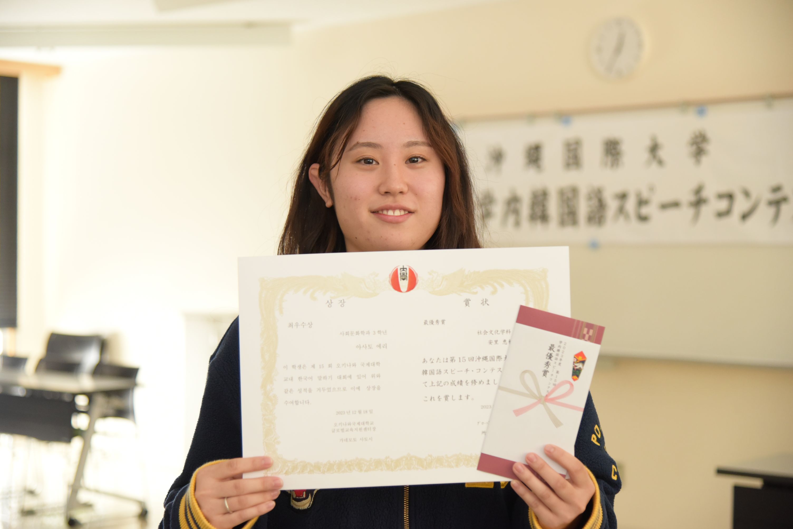 最優秀賞に輝いた安里さんのスピーチは、海外研修を通して沖縄のことについて思っていたより知らなかった自分自身を発見した反省を踏まえた内容のもので、高い表現力も加わった素晴らしいスピーチとなりました。安里さんからは「沢山練習した分、最優秀賞受賞という結果を残せたことがすごく嬉しいです。この経験は韓国留学前の私にとって大きな糧となりました。手伝ってくださった皆さんありがとうございました。」との感想を述べました。