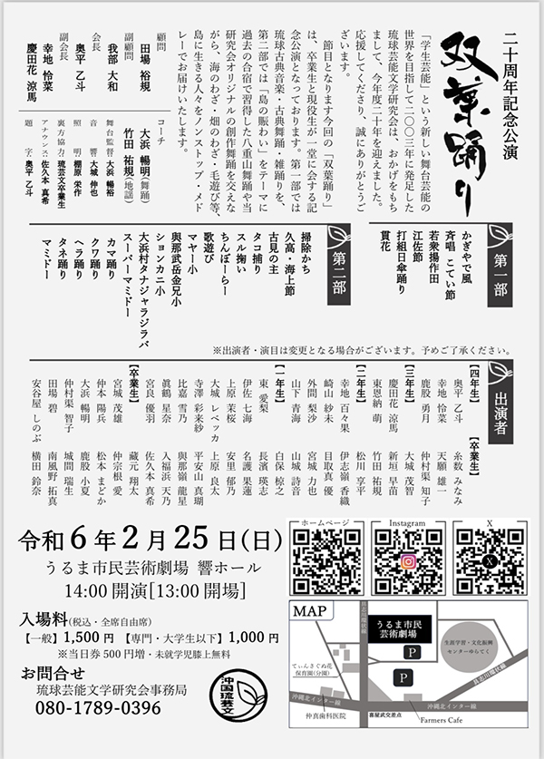 日本文化学科の学生も多く所属し、日本文化学科の田場先生、我部先生が顧問を務めておられる琉球芸能文学研究会の定期公演「双葉踊り(ふたふぁうどぅい)」が今年も開催されます!