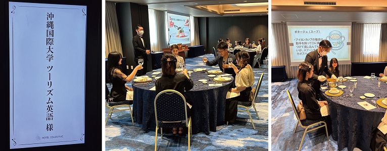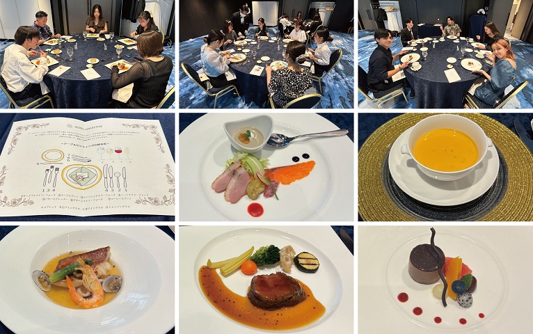 テーブルマナーのレクチャーとコース料理がセットというとてもお得で内容の濃い講座でした。新卒でホテル勤務経験のある私も知らないことが多く、とても勉強になりました。当日ドレスアップして宴会場に到着した学生は少し緊張気味でしたが、おいしい食事を口にするとすぐに笑顔になったのが印象的でした。「これは何?」、「初めて~を食べた」、「お肉、おいしい!」など、クラスメートとの会話も弾みました。テーブルマナーを身につけることはもちろんですが、作法の歴史的背景、料理や食材の語源の知識、そしてヨーロッパを中心とする異文化理解にもつながったと思います。個人的には将来ホテルや観光業に関心を持つ学生が増えることを期待しています。