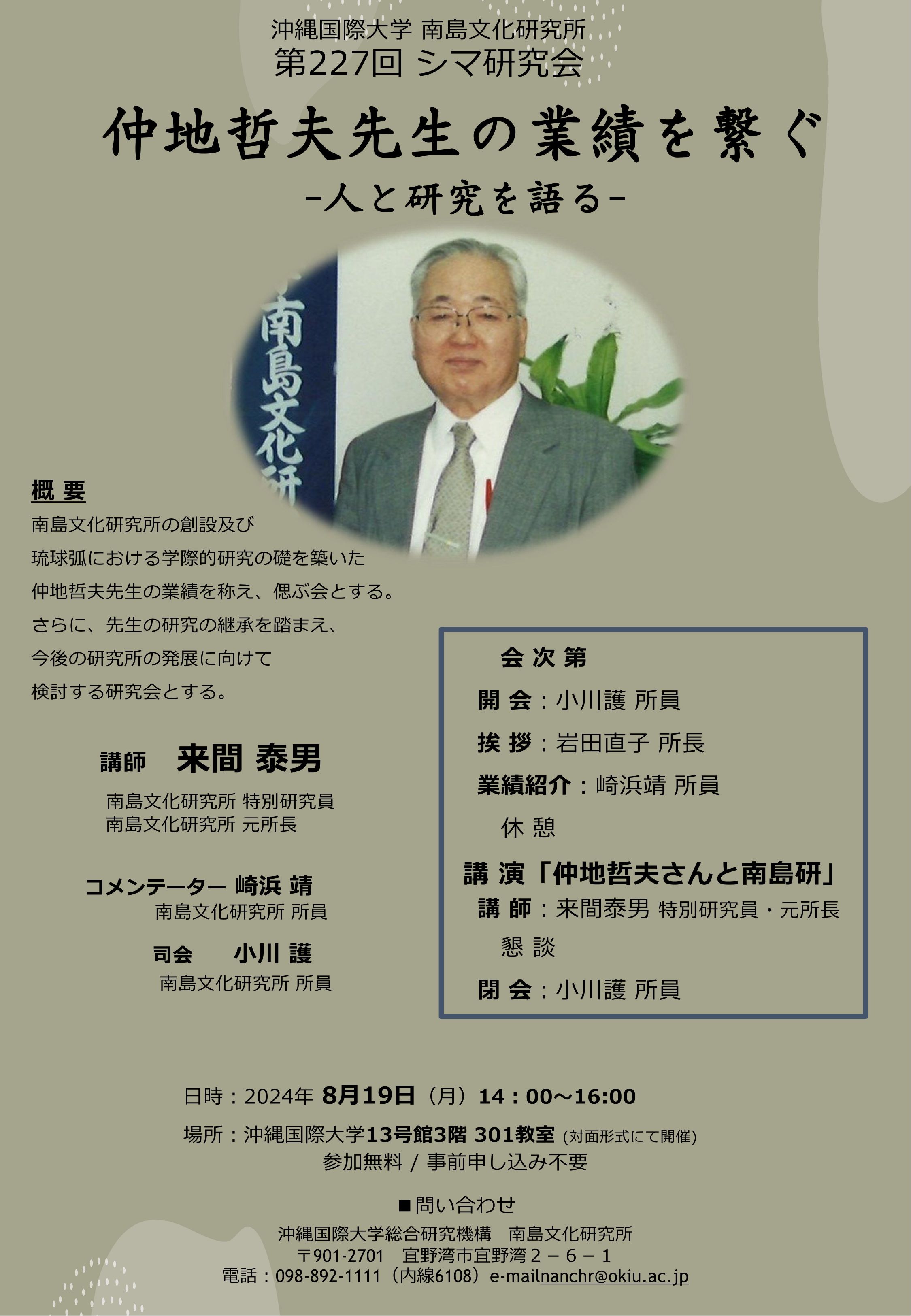 【南島研】第227回 シマ研究会「仲地哲夫先生の業績を繋ぐ-人と研究を語る-」を開催しました